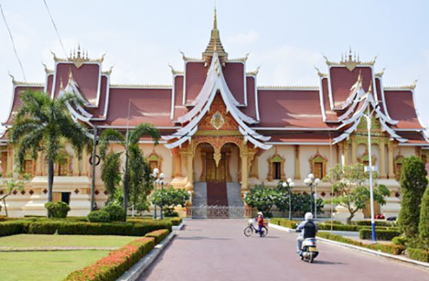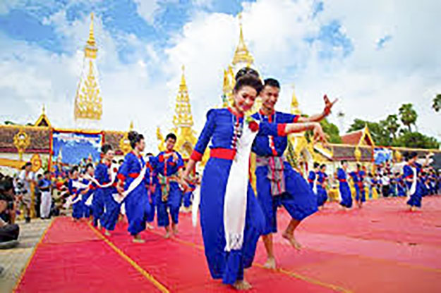 Đến với Lào là đến với xứ sở của Phật giáo, nơi có tỉ lệ chùa so với dân số cao nhất thế giới với tổng cộng 1.400 ngôi chùa (1400 ngôi chùa/6 triệu người) . Chùa gắn với trường học, gắn cả với đời. Thăm đất nước Lào, tôi khá ấn tượng với những ngôi chùa kiến trúc độc đáo và những mái chùa cong cong lạ mắt. Cùng với chùa chiền là những lễ hội quanh năm, tháng nào cũng có. Lễ hội là dịp vui chơi, múa hát tưng bừng của nhân dân Lào. Trong lễ hội, người Lào vui chơi là chính, những điệu múa lam vong, những điệu nhảy truyền thống rộn rã khắp nơi.