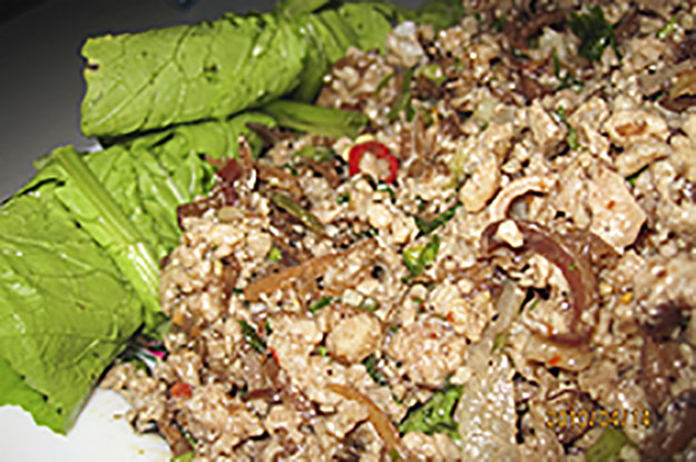 Lạp tiếng Lào có nghĩa là may mắn, là món ăn truyền thống trong lễ hội của người Lào và cũng là món ăn dân tộc gần gũi nhất của họ. Món lạp không thể thiếu trong Tết cổ truyền Bunpimay. Được làm từ thịt động vật, thường là thịt bò, thịt hươu hoặc có thể là thịt trâu, cá. cay.