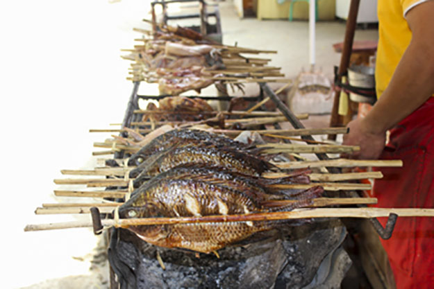 Bên cạnh món lạp, món nướng của Lào cũng rất đặc sắc và hấp dẫn. Nguyên liệu chủ yếu cho món nướng là các loại gà, cá, heo, bò…. Bước vào các quán ăn và các khu chợ đêm của Lào bạn sẽ dễ dàng bắt gặp hình ảnh quầy đồ nướng là những chiếc bàn kê liên tiếp, bên trên lót những tấm lá chuối còn xanh mướt, dính đầy dầu mỡ của những xiên thịt. Những xiên đồ ăn xếp đầy mặt bàn. Nào là cá lóc xiên nướng trui, là cá chẽm (hay cá hồng) nướng lửa than; đùi gà, cánh gà, hay cả con gà được xiên hay kẹp bằng xiên tre, vàng ươm; những con chim cút bóng loáng, những tảng thịt heo ba rọi da giòn nằm ngay ngắn trên tàu lá chuối còn xanh.