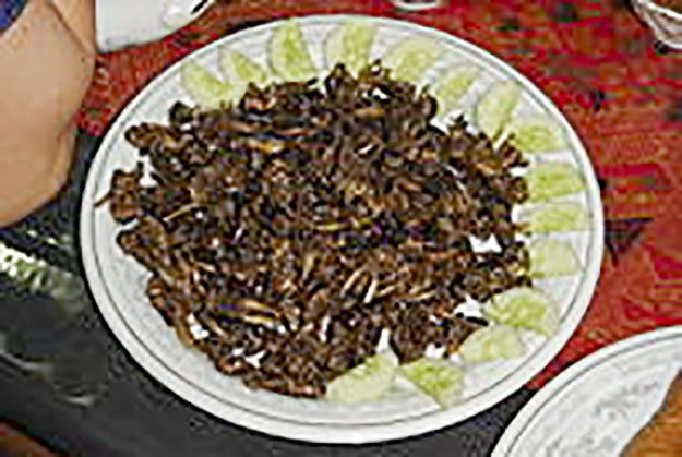 Đến thăm đất nước Lào, chắc chắn không thể quên được các món ăn từ côn trùng. Giống như người Campuchia và Thái Lan, người Lào rất thích các món ăn được chế biến từ côn trùng. Từ dế cơm, trứng kiến đến con cà cuống, nhền nhện trong các món chiên, xào, dồn đậu phộng đến hấp cơm hay ngâm giấm đều rất ngon. Đắt nhất vẫn là con cà cuống – một loại côn trùng có ích sống nhiều ở đồng ruộng Campuchia với hương vị thơm cay. Tuy nhiên, món ăn từ côn trùng của Lào lại ít món hơn người Thái Lan và ít phổ biến hơn.