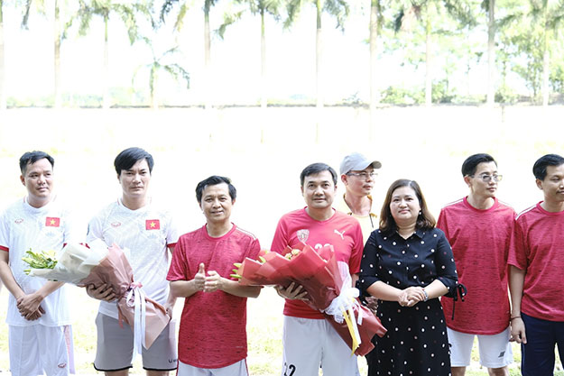 Phát biểu tại buổi giao lưu đồng chí Chăn Thạ Phon Khăm Mạ Ni Chăn, Tham tán, Phó Đại sứ cảm ơn sự tạo điều kiện của BGH Nhà trường về học tập, sinh hoạt lưu học sinh Lào đang học tập tại trường cũng như chương trình giao lưu bóng đá ngày hôm nay, mong rằng trong thời gian tới sẽ có nhiều hoạt động giao lưu hơn nữa giữa hai bên. Nhân buổi giao lưu Đoàn thanh niên ĐSQ Lào cũng đã có món quà gửi tặng đến đội bóng đá nam cán bộ, giáo viên trường. Đại diện BGH Nhà trường cũng có bó hoa gửi tặng hai đội bóng.