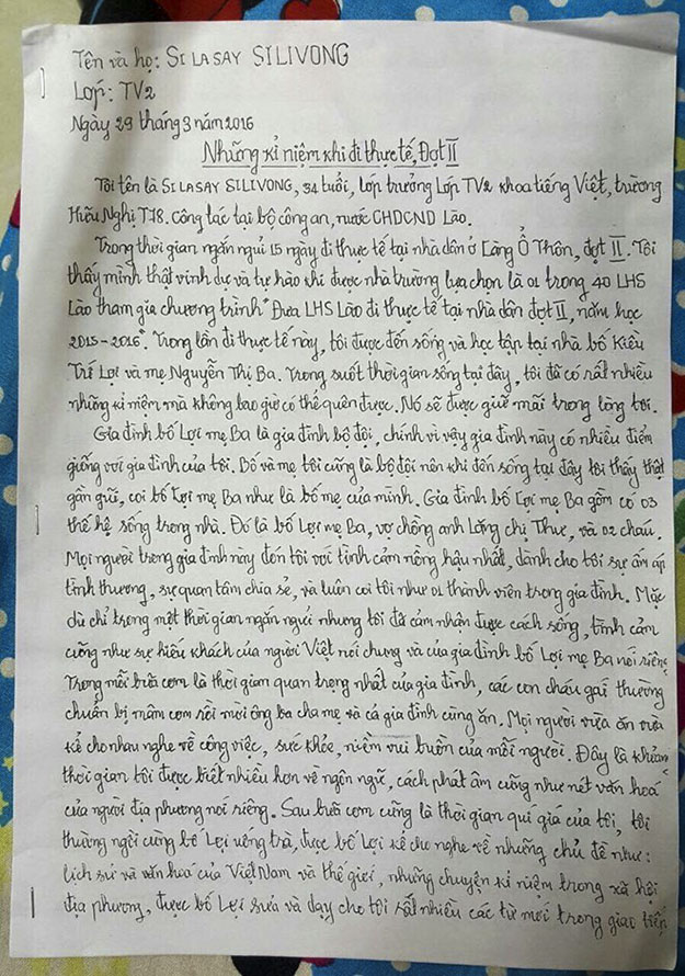 Cũng như Soukthaxay, anh Silisay Silivong, 35 tuổi, hiện đang theo học cao học tại Học viện Ngoại giao Việt Nam, trước đây là lưu học sinh Lào lớp TV2 cũng đã trải qua 15 ngày tham gia chương trình đào tạo homestay. Với anh Silisay Silavong, đó là quãng thời gian rất nhiều kỷ niệm đẹp của anh khi theo học tại Việt Nam, anh thấy rất thân quen, gần gũi như đang ở Lào. “Sau những bữa cơm, tôi thường cùng bố Lợi ngồi uống trà, bố kể cho tôi nghe về quãng thời gian bố đi bộ đội, tham gia chiến dịch đường 95 Lào, xuất phát từ Quảng Bình. Mẹ Ba thường kể cho tôi nghe câu chuyện văn hóa, phong tục, các lễ hội làng, các danh lam thắng cảnh, các anh hùng Việt Nam… Qua đó, tôi thấy khả năng nghe nói, cách phát âm so tiến bộ rất nhanh với trước khi đi học. Trước đó, tôi có thể nghe được khoảng 65%, nói được 60%, nay nghe được khoảng 80%, nói được 85%, rất tự tin giao tiếp với người Việt,” anh Silisay Silivong nói.