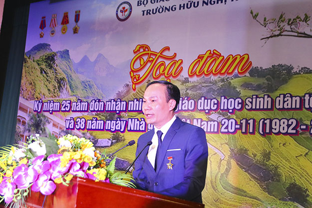 Sau chương trình văn nghệ đặc sắc chào mừng là bài phát biểu nhân dịp kỷ niệm 25 năm đón nhận nhiệm vụ giáo dục học sinh dân tộc và 38 năm ngày nhà giáo Việt Nam 20/11 của đồng chí Lê Phú Thắng– Bí thư đảng ủy – Hiệu trưởng nhà trường. Bài phát biểu nhằm ôn lại truyền thống 25 năm đón nhận nhiệm vụ giáo dục học sinh dân tộc, ý nghĩa của ngày 20-11 đồng thời nêu cao vai trò trách nhiệm của người giáo viên trong sự nghiệp trồng người. Bài phát biểu chính là những lời tâm sự chân thành, xúc động tri ân lớp lớp những thầy cô giáo đã cống hiến cho sự phát triển của nhà trường và niềm tự hào về các thế hệ học sinh T78 mà thầy giáo Lê Phú Thắng gửi tới đồng nghiệp và các em học sinh. Minh họa cho bài phát biểu của đồng chí Hiệu trưởng là một phóng sự về chặng đường 25 năm thực hiện nhiệm vụ giáo dục học sinh dân tộc do Ban TTTT của trường xây dựng.