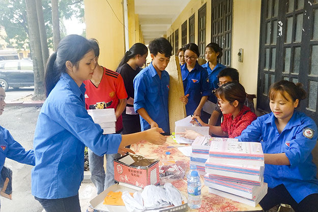Các bạn học sinh trong đội tình nguyện viên của trường giúp học sinh mới nhận phòng ở và trang cấp