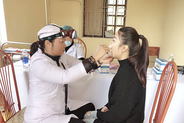 Các em được tổ y tế tổ chức khám sàng lọc ban đầu. Các y, bác sĩ từ Trung tâm y tế Huyện và trạm y tế xã phối hợp thực hiện khám chuyên khoa.
